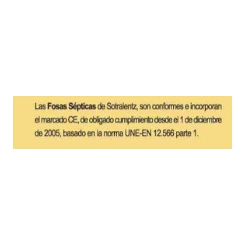 Las Fosas Sépticas, son conformes e incorporan el marcado CE, de obligado cumplimiento desde el 1 de diciembre de 2005, basado en la norma UNE-EN 12.566 parte 1.