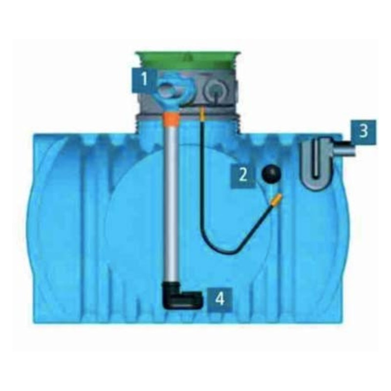 Kit pluviales premium para depósitos enterrados AT 112, compuesto por, Filtro Sinus + sifón de evacuación 110 + difusor de entrada ralentizador + flotador aspiración bomba.
