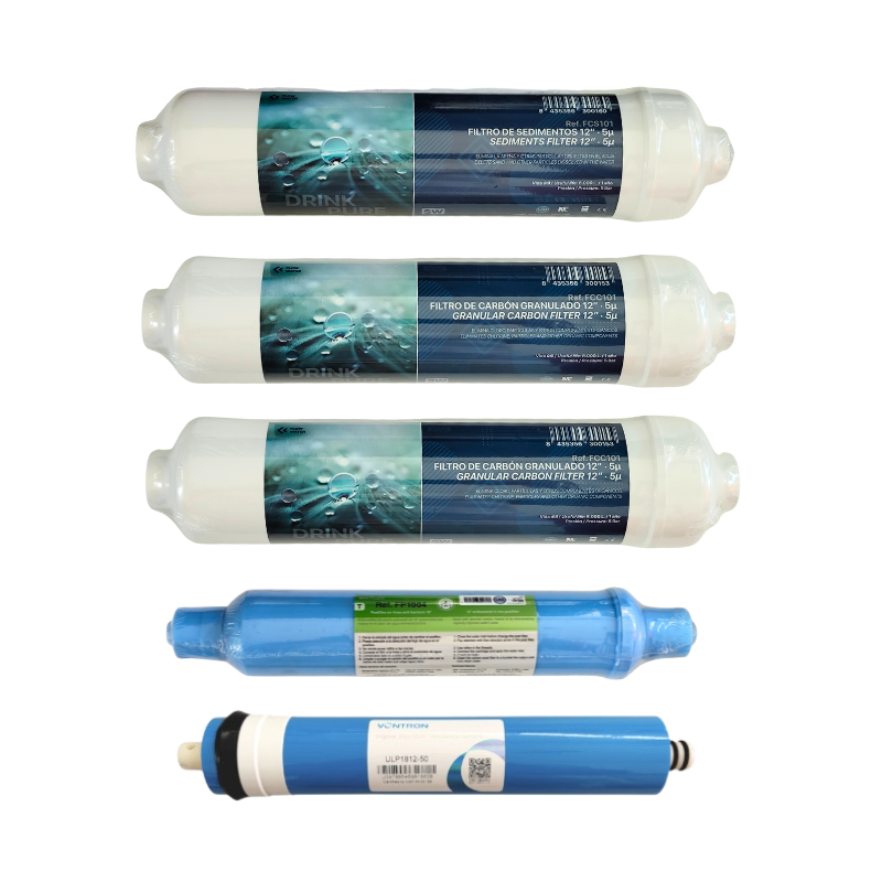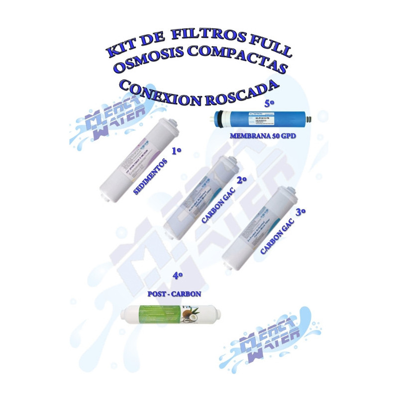 Kit compuesto por 5 filtros: sedimentos + carbón + carbón + MEMBRANA + post-filtro, con conexión roscada de 1/4" (menos la membrana que lleva espiga)