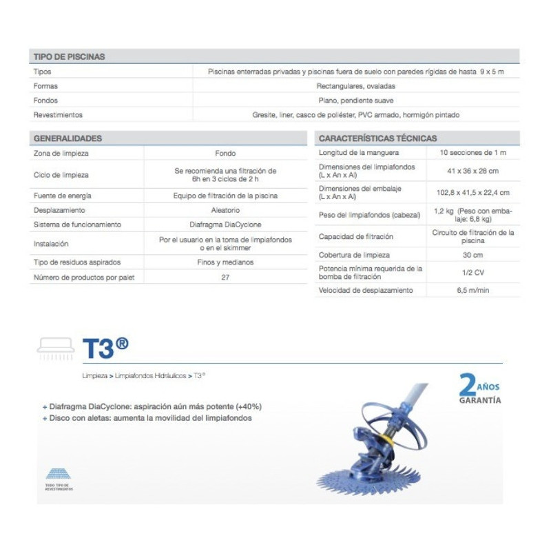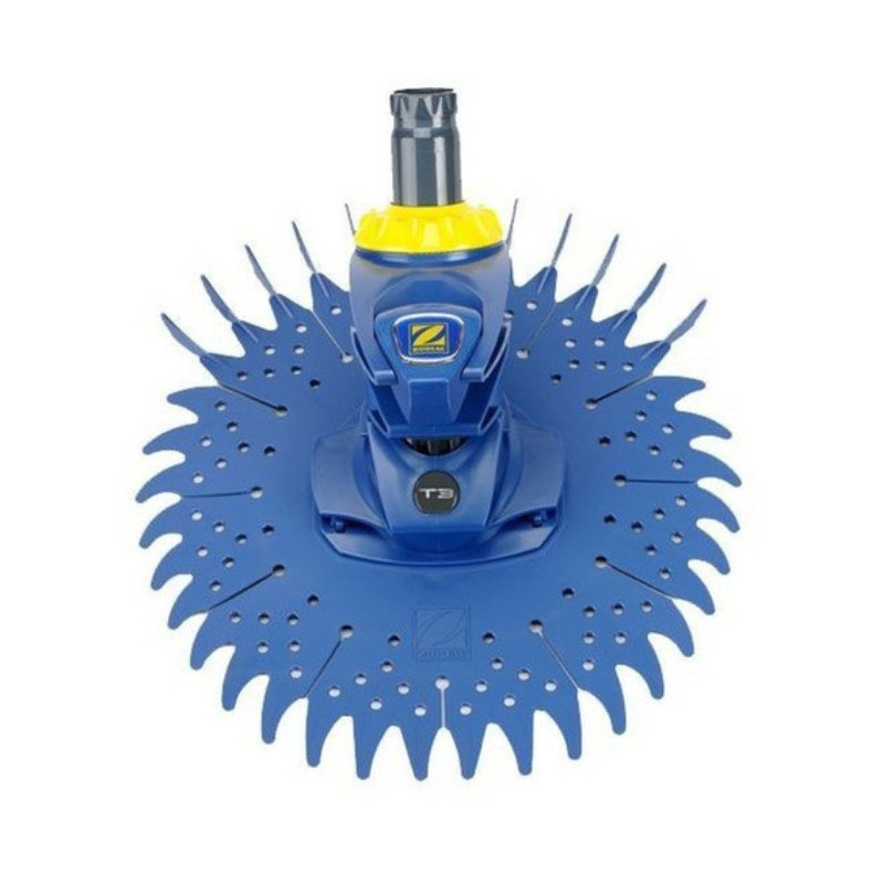 Limpiafondos hidráulico Zodiac T3 para piscinas enterradas privadas y piscinas fuera de suelo con paredes rígidas de hasta 9 x 5 m, rectangulares y ovaladas con fondo plano o pendiente suaves y con revestimientos de gresite, línea, casco de poliéster, PVC armado y hormigón pintado.