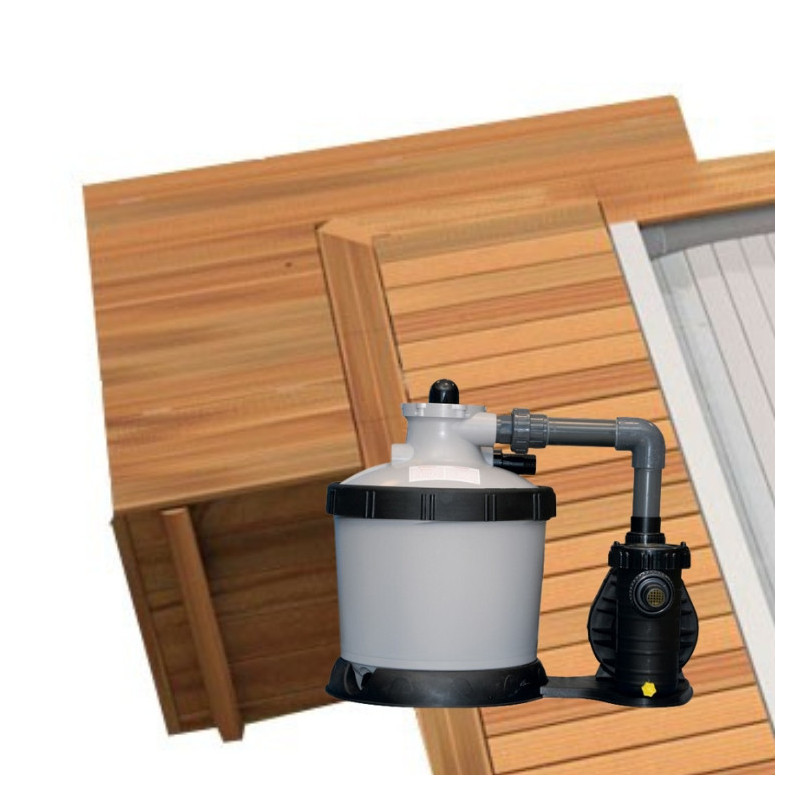Caseta de madera hecha de listones de 28 mm de espesor. El perfil de la tapa corresponde a la coronación de la piscina. Grupo de filtración de arena gris claro P-GFI 400, 4m3/h (suministrado con el medio filtrante) con tapa extraíble, bomba autocebante con pre-filtro, válvula de 6 vías y tubería