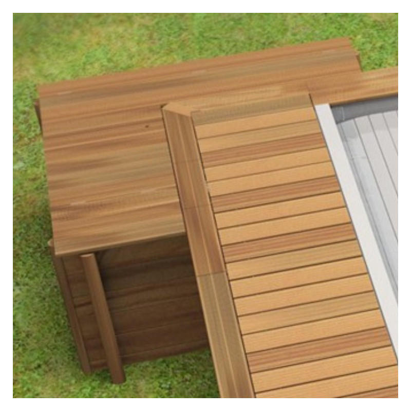 Caseta de madera hecha de listones de 28 mm de espesor. El perfil de la tapa corresponde a la coronación de la piscina. Grupo de filtración de arena gris claro P-GFI 400, 4m3/h (suministrado con el medio filtrante) con tapa extraíble, bomba autocebante con pre-filtro, válvula de 6 vías y tubería