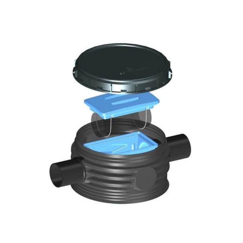 Filtro en forma de cesta desmontable integrado en realce de ø600. Apto para todos los depósitos con opción de boca de ø600. Diámetros de entrada y salida 100mm.