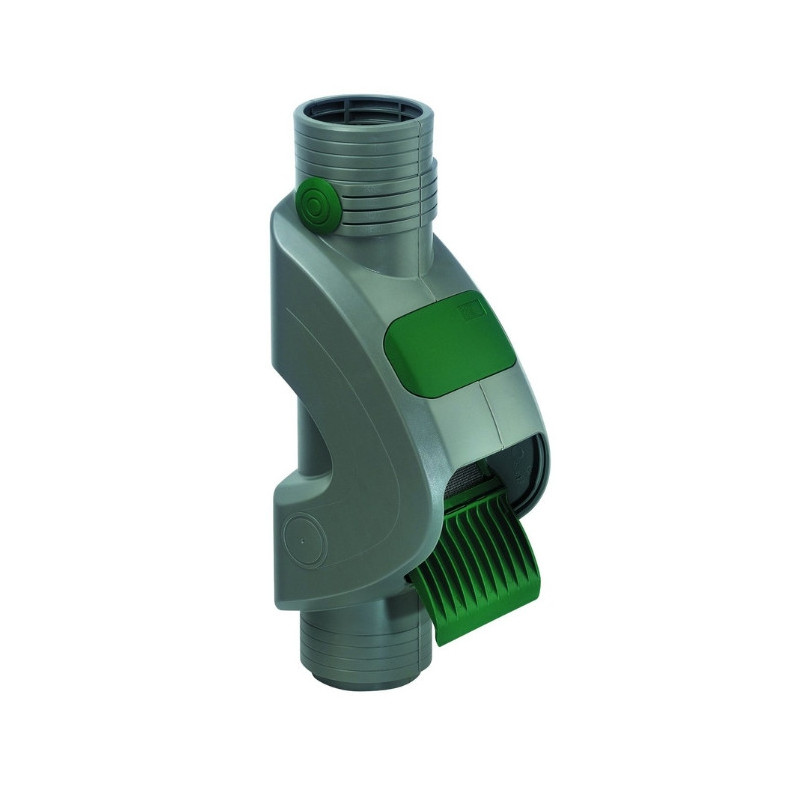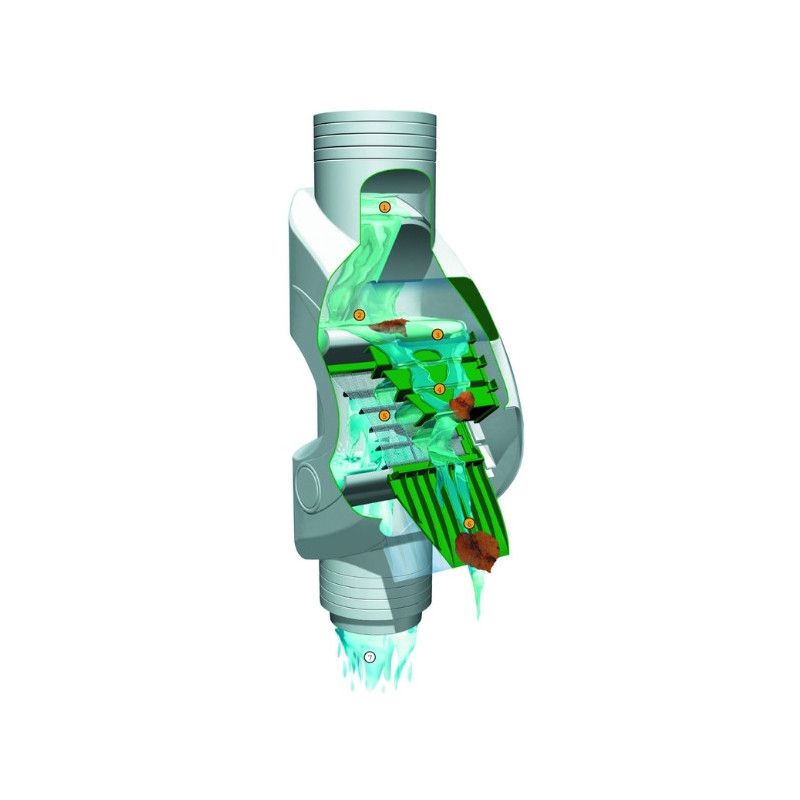 Filtro vertical para bajante fabricado en ABS, en el que el agua limpia sigue por la salida inferior hacia el depósito de almacenaje, tras haber sido filtrada mediante un sistema de cascadas con filtros de malla de acero. Diámetro de entrada: 100mm, y de salida: 110mm.