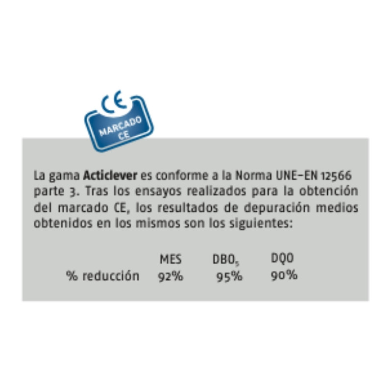 La gama Acticlever es conforme a la Norma UNE-EN 12566 parte 3. Tras los ensayos realizados para la obtención del marcado CE, los resultados de depuración medios obtenidos en los mismos son los siguientes: