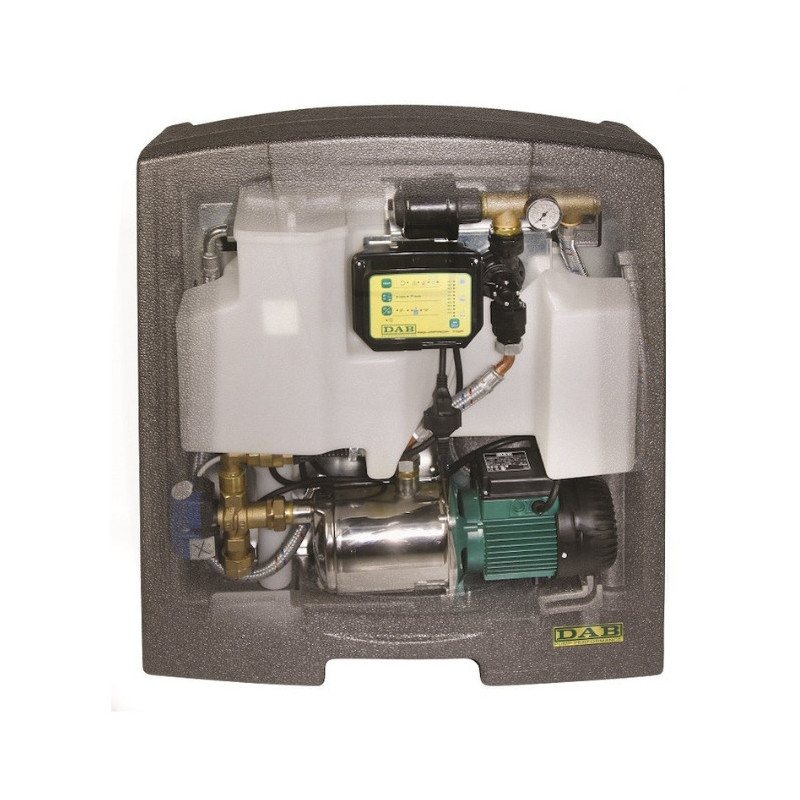 Unidad de Aguas Pluviales RMQ 3-45 A. Sistema de gestión de agua de lluvia, diseñado para el control del agua almacenada en el depósito. Potencia: 1,35CV. Presión máxima de funcionamiento: 4,5 bares. Caudal máximo: 3,5m3/h. Aspiración máxima: 4m